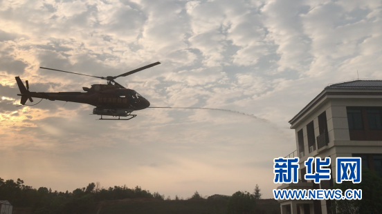 图为消防直升机对着火建筑进行灭火水剂喷射。新华网 黄浩摄