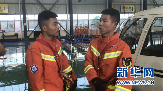 图为消防员(左唐运德,右李金地)进行演练后经验交流。新华网 黄浩 摄