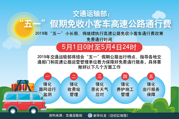 交通运输部新闻发言人吴春耕在当日召开的例行新闻发布会上表示,今年交通运输部将结合“五一”假期公路出行特点,指导各地交通部门和高速公路运营管理单位着力保障好免费通行服务。具体要做好以下几个方面工作: