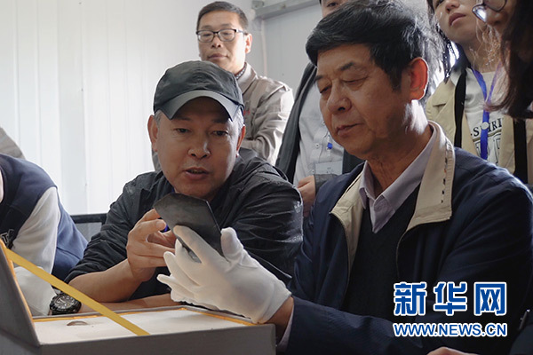 4月29日,考古学家研究讨论黄山遗址新出土的玉钺。 新华社记者 袁月明 摄