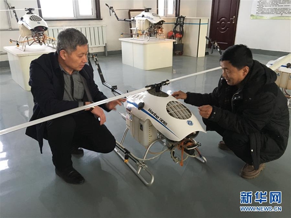 孙斌(左)在公司与同事一起保养无人机(2月2日摄)。新华社记者 王君宝 摄