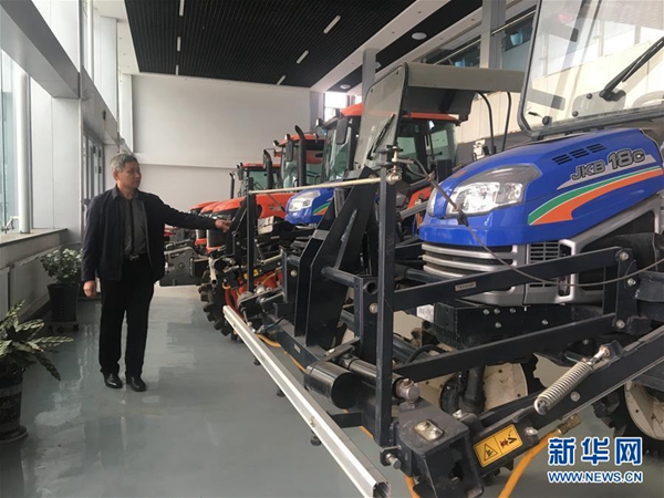孙斌在公司查看农机具(2月2日摄)。新华社记者 王君宝 摄
