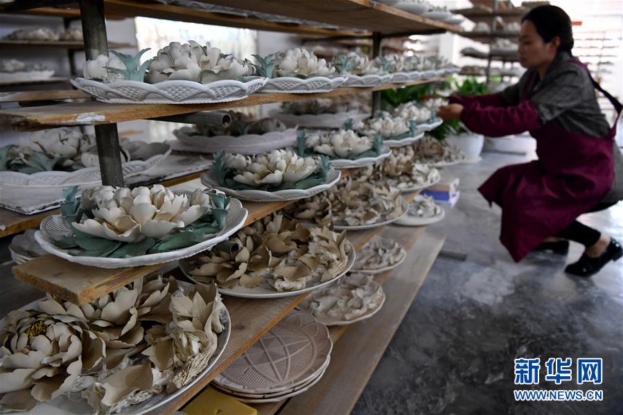 洛阳牡丹瓷股份有限公司的员工将半成品放置在架子上(4月25日摄)。新华社记者 李嘉南 摄
