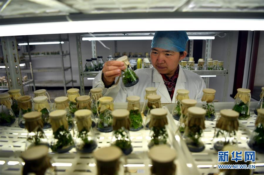 工作人员在洛阳国家牡丹园组织培养室中观察牡丹组织培养苗生长情况(4月24日摄)。新华社记者 李嘉南 摄
