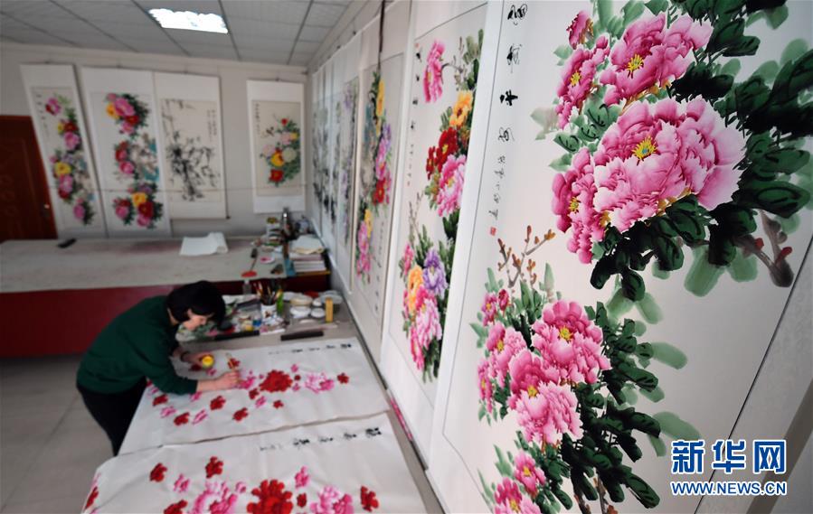 画师在中国平乐牡丹画创意园区进行创作(4月25日摄)。新华社记者 李嘉南 摄