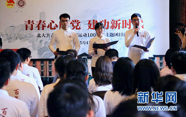新华网北京5月4日电(潘子荻)“青春心向党 建功新时代”北大共青团纪念五四运动100周年主题团日活动4日在北京大学红楼举行。