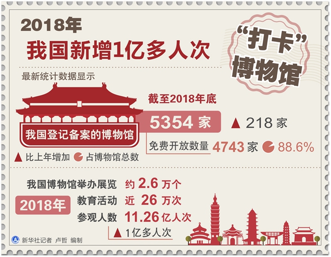 新华社长沙5月18日电(记者施雨岑、柳王敏)最新统计数据显示,2018年,我国博物馆举办展览约2.6万个,教育活动近26万次,参观人数达11.26亿人次,比上年增加1亿多人次。