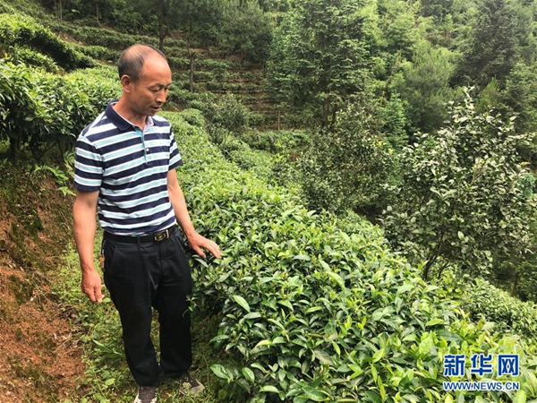5月25日,湖南省宜章县莽山瑶族乡永安村村民陈仁红在自家的茶园里查看茶树长势。新华社记者 陈宇箫 摄