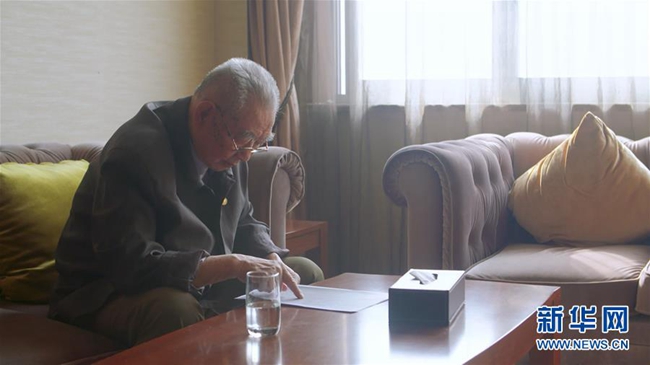 今年90岁高龄的王昭堃老人念着当年解放上海时牺牲的烈士名单,追忆战友(视频截图)。新华社发