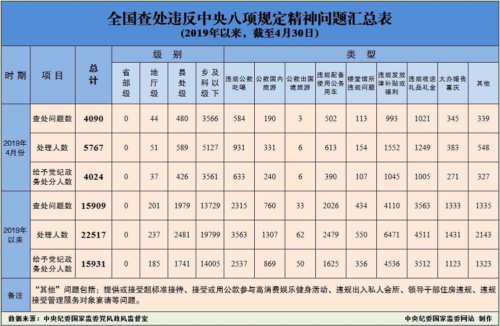 据中央纪委国家监委网站消息,为掌握全国贯彻落实中央八项规定精神情况,中央纪委在各省区市和新疆生产建设兵团、各中央和国家机关、各中央企业和中央金融企业等建立了落实中央八项规定精神情况月报制度。2019年以来,截至4月30日,全国查处违反中央八项规定精神问题情况如下: