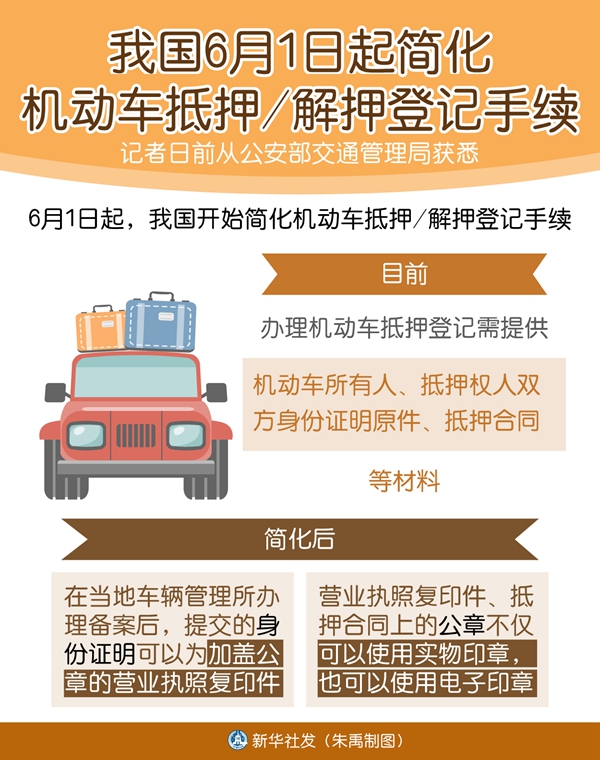 新华社北京5月28日电(记者王茜)6月1日起,我国开始简化机动车抵押/解押登记手续。这是记者日前从公安部交通管理局获悉的。
