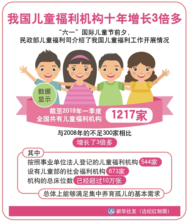 新华社北京5月31日电(记者罗争光)“六一”国际儿童节前夕,民政部儿童福利司介绍了我国儿童福利工作开展情况。数据显示,截至今年一季度,全国共有儿童福利机构1217家,与2008年的不足300家相比,增长了3倍多。