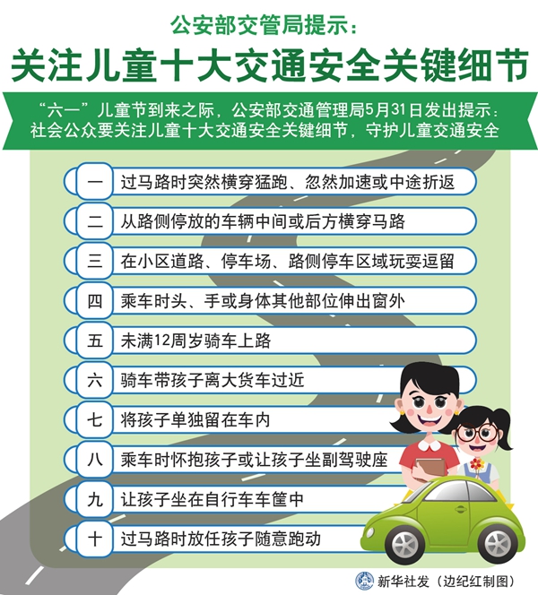 新华社北京5月31日电(记者王茜)儿童的交通危险认知、自我保护能力不强,容易受到交通意外的伤害。“六一”儿童节到来之际,公安部交通管理局31日发出提示:社会公众要关注儿童十大交通安全关键细节,守护儿童交通安全。
