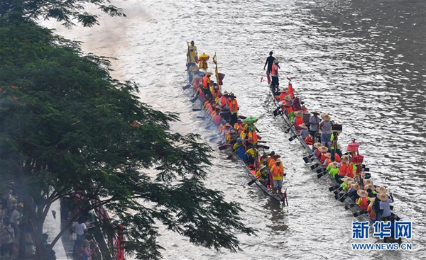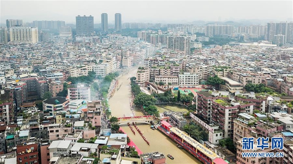 各村的龙舟沿着珠江陆续来到车陂涌“趁景”(6月5日摄)。新华社记者 刘大伟 摄