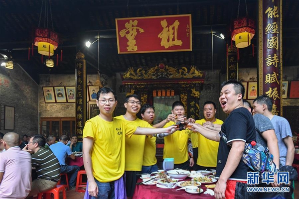 应邀前来“趁景”的龙舟队员在车陂晴川苏公祠吃“龙船饭”(6月5日摄)。新华社记者 刘大伟 摄