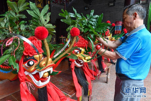 车陂尚书王公祠供奉着王太原龙船会五条龙舟的龙头龙尾(5月21日摄)。新华社记者 刘大伟 摄