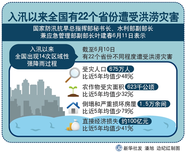 新华社北京6月11日电(记者胡璐)国家防汛抗旱总指挥部秘书长、水利部副部长兼应急管理部副部长叶建春11日表示,入汛以来全国出现14次区域性强降雨过程。截至6月10日,有22个省份不同程度遭受洪涝灾害,受灾人口675万人,比近5年均值少48%。