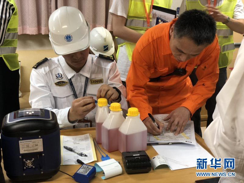 6月1日,深圳海事局执法人员正使用快速燃油检验仪检测燃油。