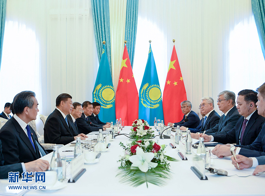 6月13日,国家主席习近平在比什凯克会见哈萨克斯坦总统托卡耶夫。 新华社记者 高洁 摄
