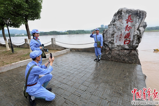 6月12日,中央红军长征第一渡纪念碑园,游客在长征渡口碑前拍照。 中国青年报·中青在线记者 李建泉/摄