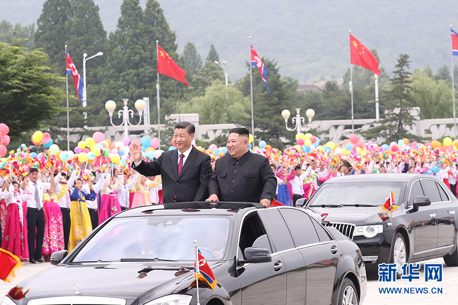 6月20日,中共中央总书记、国家主席习近平乘专机抵达平壤,开始对朝鲜民主主义人民共和国进行国事访问。朝鲜劳动党委员长、国务委员会委员长金正恩和夫人李雪主到机场热情迎接习近平和夫人彭丽媛。朝方在机场举行隆重欢迎仪式。欢迎仪式结束后,习近平与金正恩同车前往锦绣山太阳宫广场,沿途数十万群众夹道欢迎。 新华社记者 申宏 摄