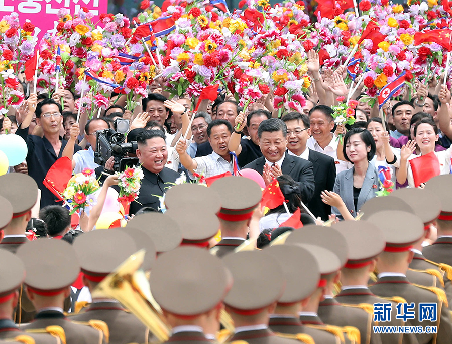 习近平抵达黎明大街路口,换乘敞篷车,与金正恩同车前往锦绣山太阳宫广场。街道两旁,人山人海,盛况空前。欢迎民众站在高坡上,从住宅楼的窗台上,向中国贵宾欢呼致敬。到处都是热情的笑脸,友好的欢呼声不绝于耳。习近平和金正恩向欢迎的人群频频挥手致意。