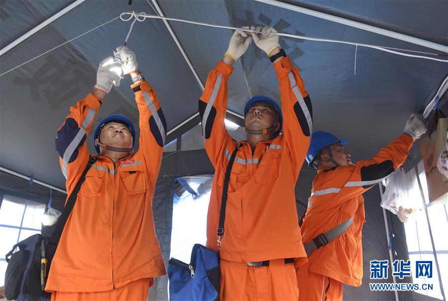 6月20日,国网成都供电公司连心桥共产党员服务队抗震救灾临时党支部成员在安置点帐篷内架设电线、安装电灯。新华社记者 刘坤 摄