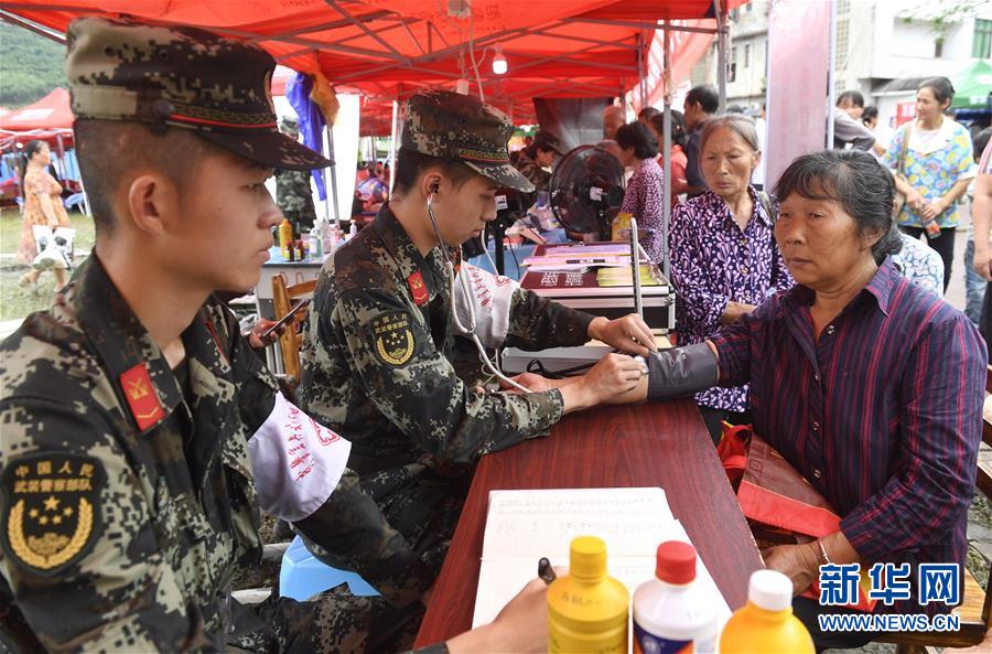 6月20日,武警宜宾支队卫生队党小组成员在安置点为群众提供医疗服务。新华社记者 刘坤 摄