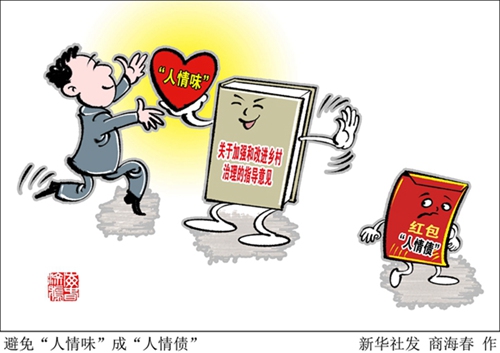 近日,中办、国办印发《关于加强和改进乡村治理的指导意见》。意见提出,全面推行移风易俗,整治农村婚丧大操大办、高额彩礼、铺张浪费、厚葬薄养等不良习俗。依靠群众因地制宜制定村规民约,提倡把喜事新办、丧事简办、弘扬孝道、尊老爱幼、扶残助残、和谐敦睦等内容纳入村规民约。