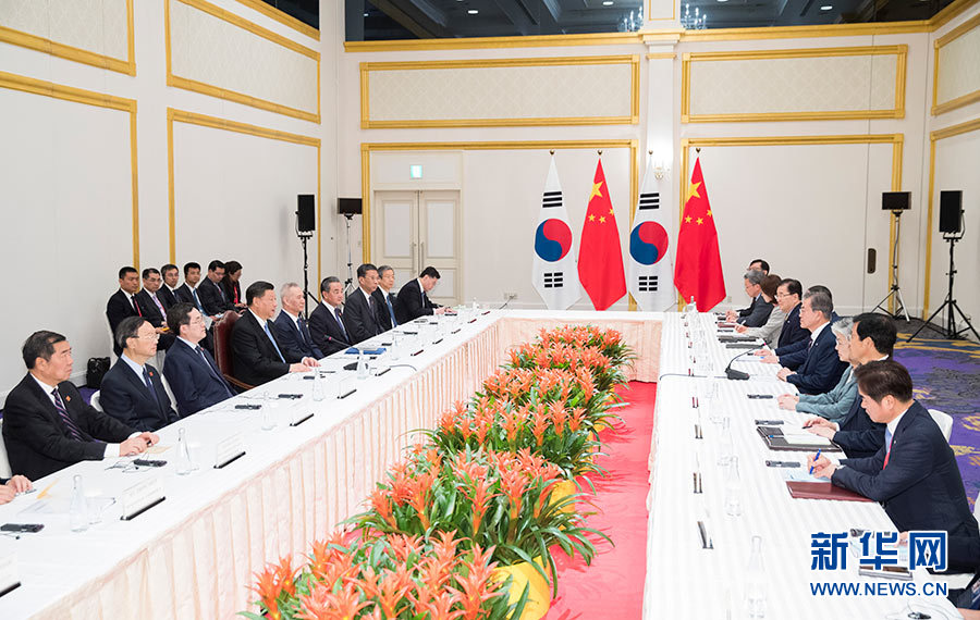 两国元首还就朝鲜半岛形势交换了看法。习近平表示,我上周应邀对朝鲜进行了国事访问,同金正恩委员长就中朝关系、半岛形势深入交换了意见。从我这次访问朝鲜和近期各方面情况看,半岛缓和对话的大势没有变,政治解决仍是各方的优先选项。事实证明,只有通过对话协商,按照分阶段、同步走原则,逐步解决各自合理关切,才能找到出路。下一步,我们应该加大促谈力度,共同做有关方工作。中方支持朝美举行新一轮领导人会晤,希望双方相互显示灵活,争取对话取得进展。半岛应坚持无核化方向,同时朝方的合理关切也应得到重视和回应。文在寅表示,几天前,习近平主席访问朝鲜,为推动半岛对话势头和维护半岛和平稳定发挥了建设性作用,作出了重要贡献。韩方对此高度赞赏。韩方将继续致力于改善南北关系,愿同中方加强合作,为实现无核化目标和永久和平稳定作出贡献。