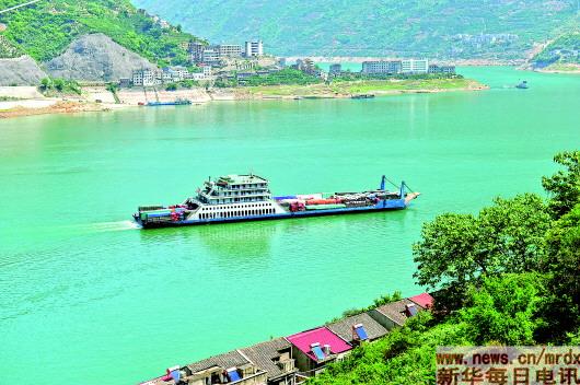 一艘滚装船舶航行在三峡库区湖北省秭归县郭家坝水域(新华社资料片)。
