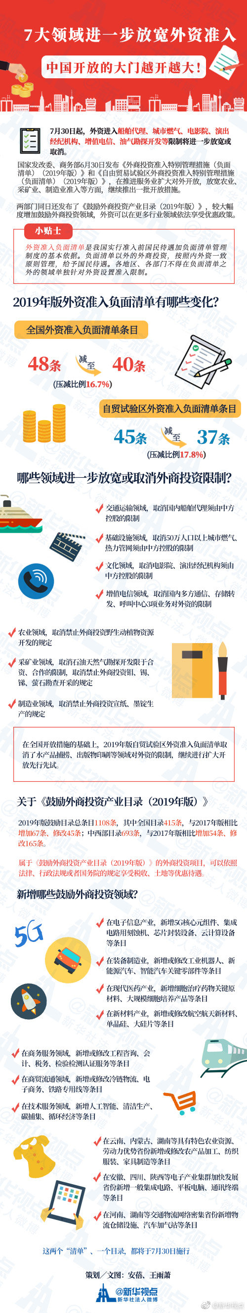 7月30日起,外资进入船舶代理、城市燃气、电影院、演出经纪机构、增值电信、油气勘探开发等限制将进一步放宽或取消。国家发改委、商务部6月30日发布《外商投资准入特别管理措施(负面清单)(2019年版)》,清单条目由48条减至40条。同日发布的《自由贸易试验区外商投资准入特别管理措施(负面清单)(2019年版)》条目由45条减至37条。(记者安蓓、王雨萧)