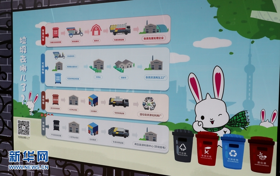 在虹口区嘉兴路街道“宇泰景苑”小区内,小区垃圾房外的装饰墙上对分类后不同垃圾的去向进行详解(6月24日摄)。 新华社记者 方喆 摄