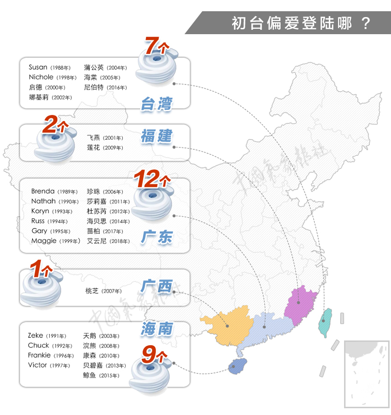 台湾和福建相比地理位置略偏北一些,且福建还得益于台湾的天然屏障作用,导致登陆台风较少,近30年只有两个初台登陆福建。