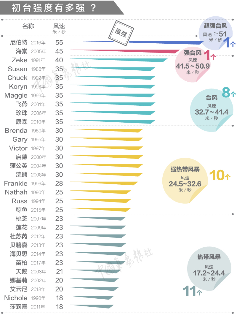 然而,也并不是所有初台都很弱。比如,2016年初台“尼伯特”于7月8日登陆台湾台东,登陆风速为55米/秒,达到超强台风。此外,2005年初台“海棠”7月18日登陆台湾时强度达强台风级,威力不容小觑。