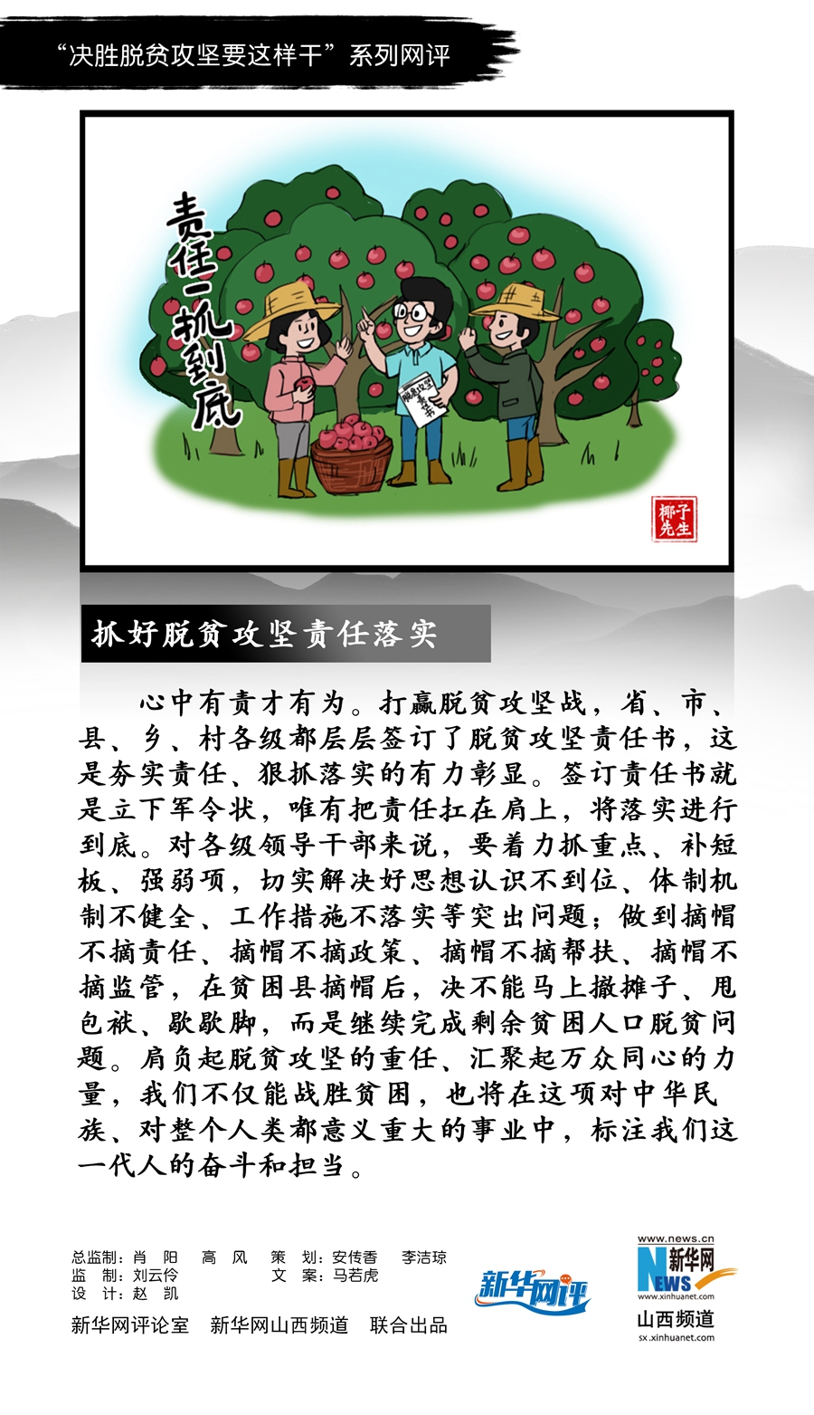 心中有责才有为。打赢脱贫攻坚战,省、市、县、乡、村各级都层层签订了脱贫攻坚责任书,这是夯实责任、狠抓落实的有力彰显。签订责任书就是立下军令状,唯有把责任扛在肩上,将落实进行到底。对各级领导干部来说,要着力抓重点、补短板、强弱项,切实解决好思想认识不到位、体制机制不健全、工作措施不落实等突出问题;做到摘帽不摘责任、摘帽不摘政策、摘帽不摘帮扶、摘帽不摘监管,在贫困县摘帽后,决不能马上撤摊子、甩包袱、歇歇脚,而是继续完成剩余贫困人口脱贫问题。肩负起脱贫攻坚的重任、汇聚起万众同心的力量,我们不仅能战胜贫困,也将在这项对中华民族、对整个人类都意义重大的事业中,标注我们这一代人的奋斗和担当。(马若虎)