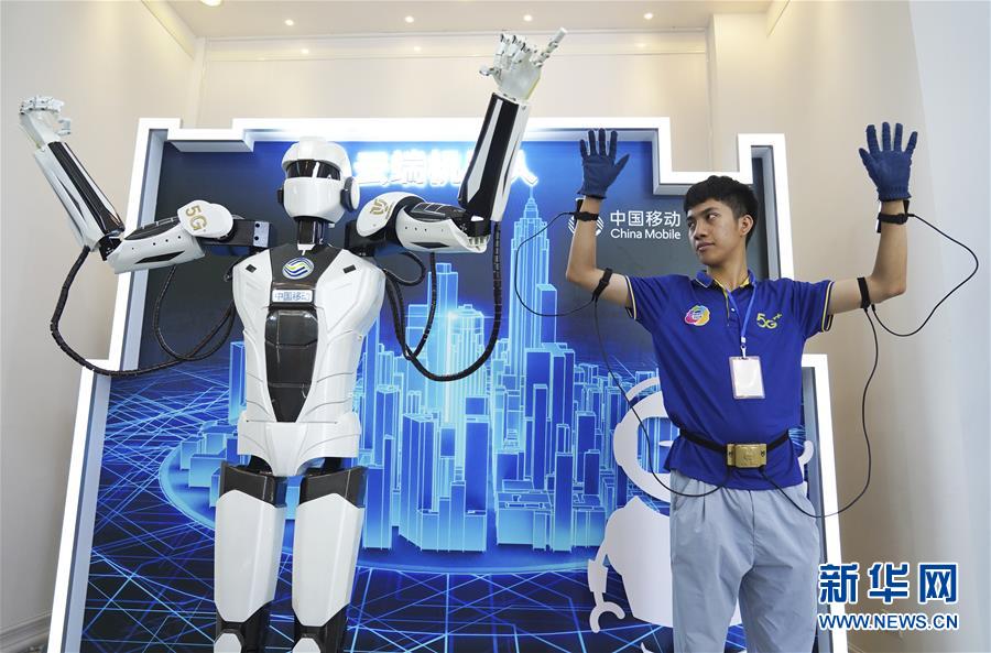 在江西鹰潭举行的2019江西国际移动物联网博览会上,工作人员在展示模拟人类动作的机器人(7月18日摄)。新华社记者 周密 摄
