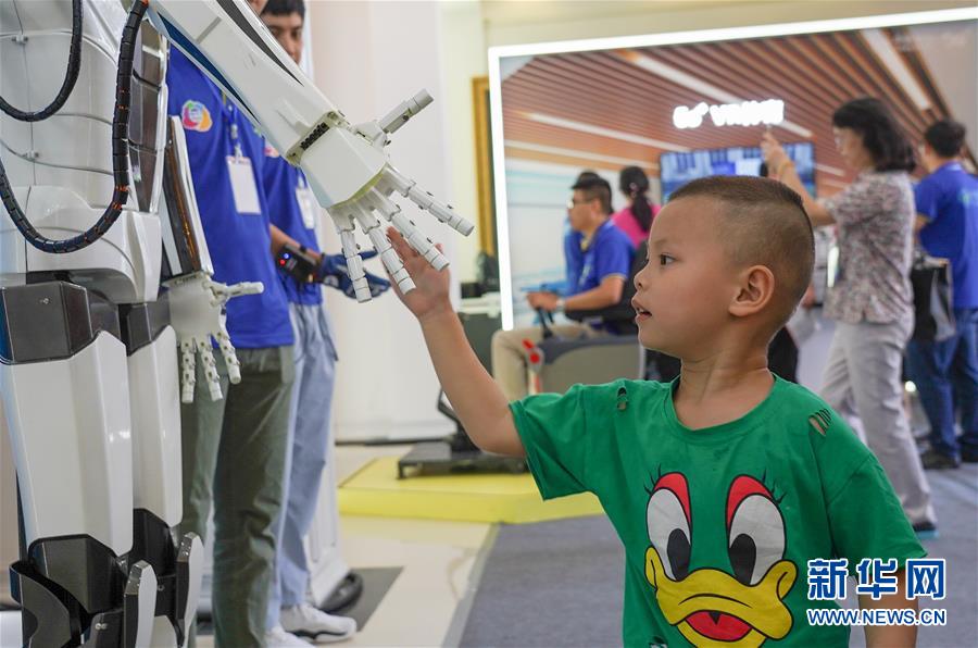 7月18日,一名小观众在和机器人握手。新华社记者 周密 摄