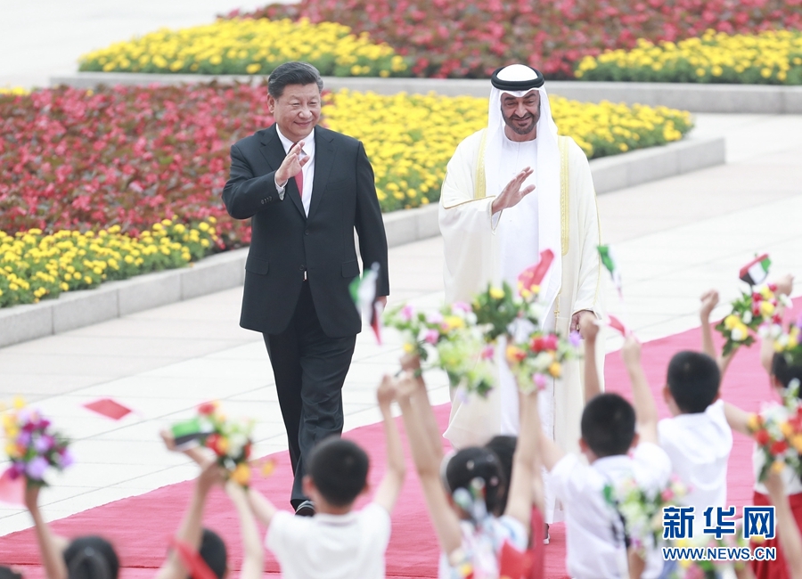 7月22日,国家主席习近平在北京人民大会堂同阿联酋阿布扎比王储穆罕默德举行会谈。这是会谈前,习近平在人民大会堂东门外广场为穆罕默德举行欢迎仪式。新华社记者翟健岚摄