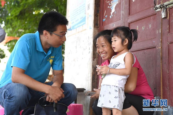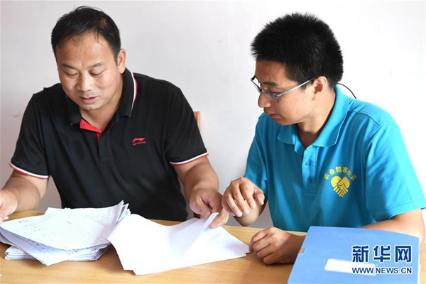 杨杰兴(左)在广西乐业县百坭村向村民了解孩子读幼儿园的情况(8月1日摄)。新华社记者 周华 摄