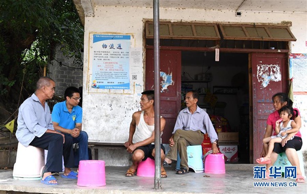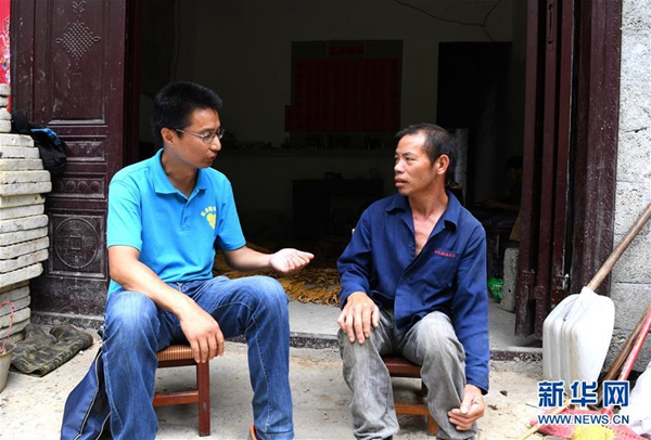 杨杰兴(左)在广西乐业县百坭村与村民班龙排拉家常(8月1日摄)。新华社记者 周华 摄