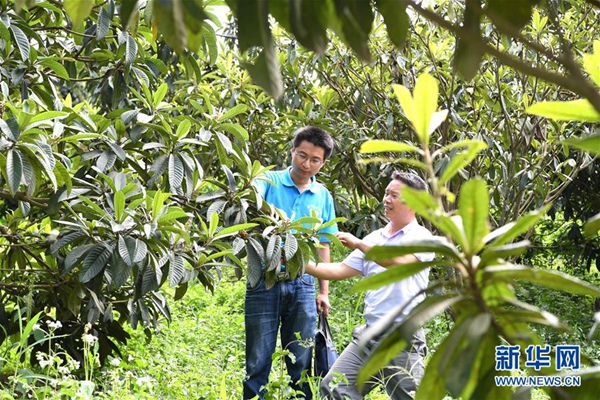 杨杰兴(左)在广西乐业县百坭村实地了解村里枇杷产业发展情况(8月1日摄)。新华社记者 周华 摄