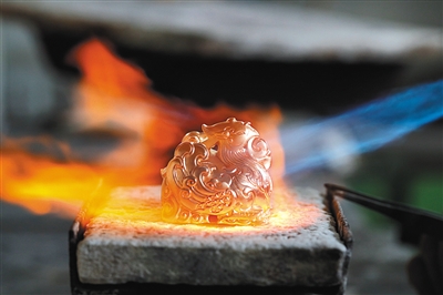 与流水降温,精雕细琢的“玉徽宝”不同,“金徽宝”的制作需要炙热的火光。