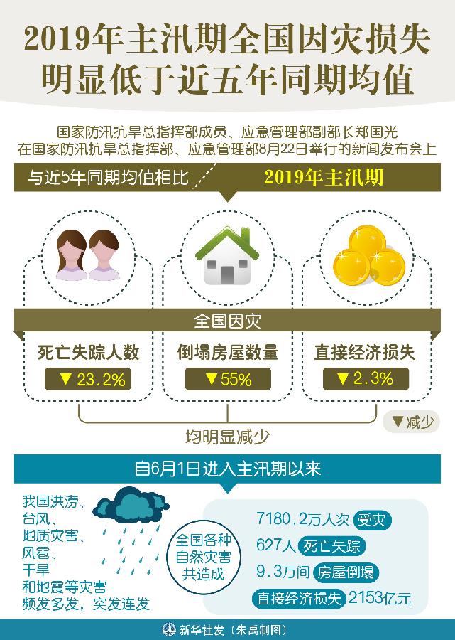 郑国光在国家防汛抗旱总指挥部、应急管理部当日举行的新闻发布会上说,与近5年同期均值相比,今年主汛期全国因灾死亡失踪人数、倒塌房屋数量和直接经济损失分别减少23.2%、55%和2.3%。