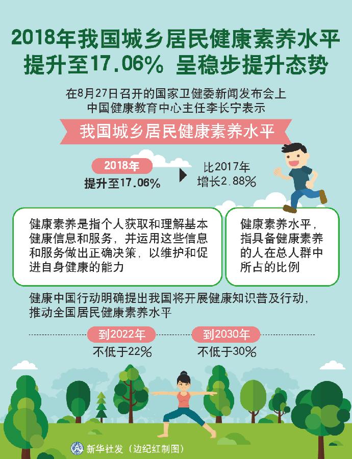 新华社北京8月27日电(记者王秉阳、温竞华)在27日召开的国家卫健委新闻发布会上,中国健康教育中心主任李长宁表示,2018年我国城乡居民健康素养水平提升至17.06%,比2017年增长了2.88%,继续呈现稳步提升态势。
