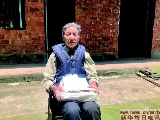 ▲90岁的熊善初老人怀抱着常德细菌战受害者名册及个人陈述书等资料。本报记者袁汝婷摄