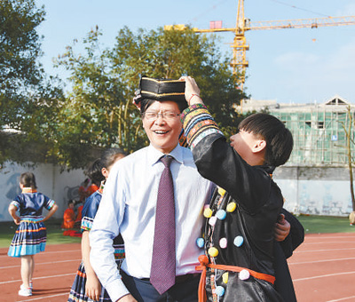 学生给陈立群(左)戴上民族特色帽子。资料照片