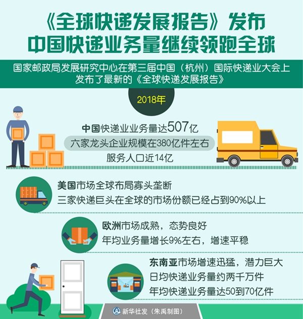报告分析称,中国快递业业务量领先,市场活跃,2018年业务量达507亿,六家龙头企业规模在380亿件左右,服务人口近14亿;美国市场全球布局寡头垄断,三家快递巨头在全球的市场份额已经占到90%以上;欧洲市场成熟,态势良好,年均业务量增长9%左右,增速平稳;东南亚市场增速迅猛,潜力巨大,日均快递业务量约两千万件,年均快递业务量达50到70亿件。