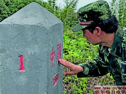 “第一次见到界碑时,特别激动,看到‘中国’二字,特别自豪!”在同伴的带领下,蔡新装用了半天时间爬到山顶,他快步上前,抚摸着碑身,擦拭着界碑上的字符,在擦拭“中国”二字时特别用心。然后仔细查看界碑周围的情况,用砍刀修剪草丛,还用手机拍下一张界碑的照片。