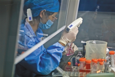 生物实验室内,工作人员在进行细胞培养。